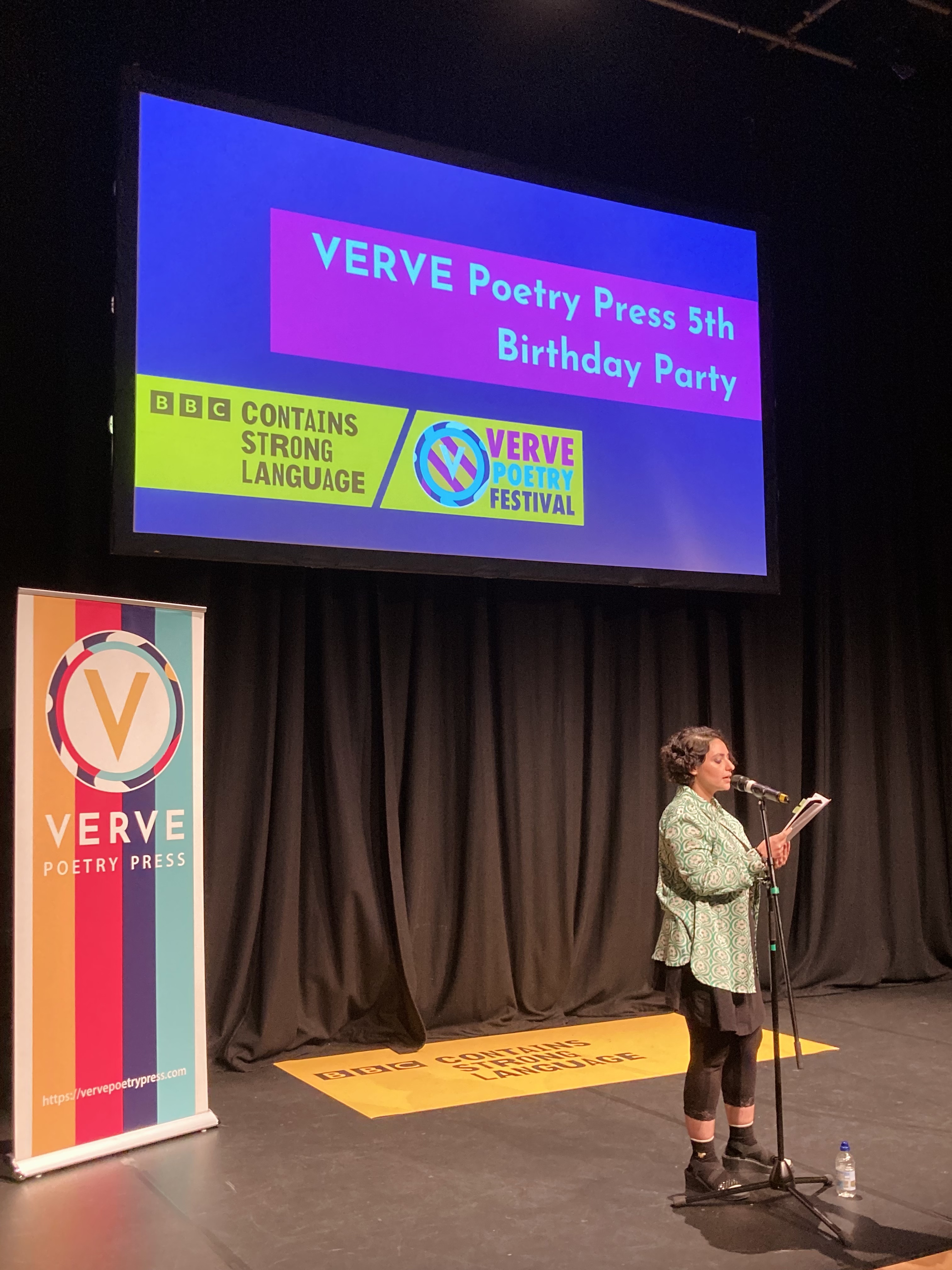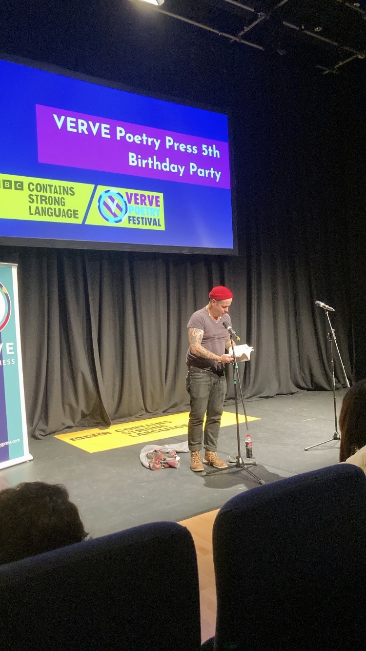 Well, if that wasn’t amazing enough, I walked out of the workshop to find none other than my poetry hero Birmingham Poet Laureate Casey Bailey! Casey had mentored me on my poetry mentorship programme with The Word Association earlier on this year, as well as holding a group workshop on skills in performance for the mentees. He was the kindest and most encouraging person to work with and I felt so empowered after our mentoring! Seeing him in person was just indescribable…I definitely was a bit of a blubbering fangirl, but he recognised me (and later introduced me to Amerah Saleh as a ‘rising star’….😭you can imagine the kind of chaos that sent me to)! Casey was there to co-host proceedings at the Verve Poetry Press 5th Anniversary event, which I was also booked on to see. He and Luke Kennard comically emceed a celebration of the immense work of Verve poets in disseminating their powerful words. We had performances from a Verve poet published in each year of the publishing press’ existence! I’ve linked each poet’s website to their name, but I’ve got to say my favourite performance was that of Jemima Hughes, who was simply incredible onstage. I want to be able to perform like her one day 🤩 . We had soulful performances from Sam J. Grudgings, Scarlett Ward Bennett, Golnoosh Noor and Amerah Saleh. It was the warmest event, full of such rich, emotional performance – I was transfixed! Please do check out all of the poets above – they are all saying such important things with their words.
